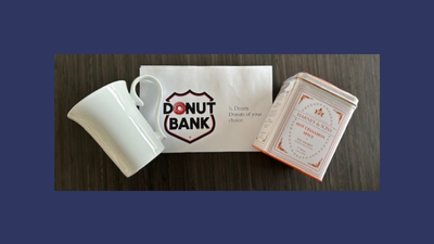 Value $20. Spiced Cinnamon Tea, a mug and a 1/2 dozen donuts from the Donut Bank.