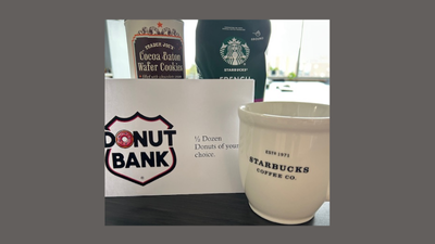 Value $25. Enjoy this coffee break with French Roast Starbucks coffee in a Starbucks mug alongside Trader Joe's Wafer Cookies AND 1/2 dozen donuts from the Donut Bank.