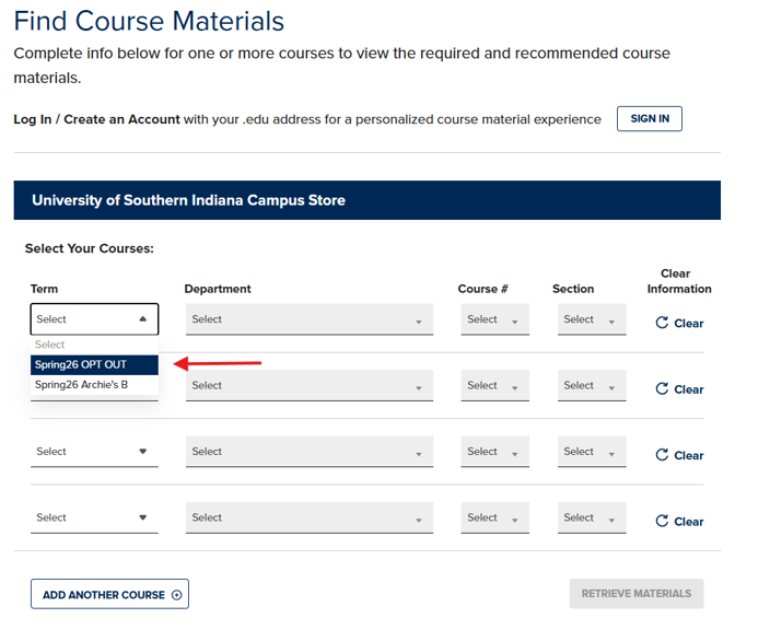 Visit the Campus Store website to find each course and its list of materials to compare the opt-out price with your bundle cost. Be sure to select "Spring26 Opt Out" to view prices.