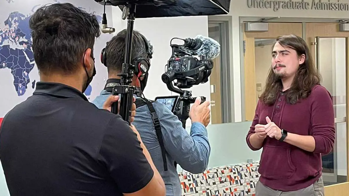 Host Alex Boylan takes a break from filming The College Tour to chat with USI President Ronald S. Rochon.