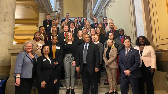 University of Southern Indiana visited the Indiana Statehouse on Tuesday, April 4, 2023. The daylong event kicked off with several legislators and USI alumni working in government affairs joining and speaking with the students over lunch. Students, alumni and staff were privileged to be invited into Lt. Governor Suzanne Crouch's office for a meet and greet session and photo. Students were also guided through a tour and allowed time to explore and observe the House and Senate Legislative Sessions in action. | April 4, 2023