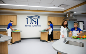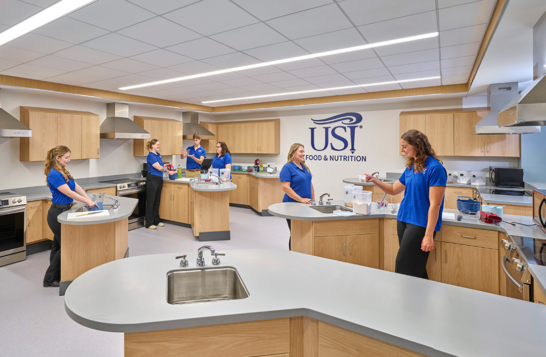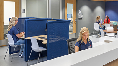 The Health Professions Center houses the Kinney College of Nursing and Health Professions and the Food and Nutrition Program. Food and Nutrition facilities include a variety of training areas.