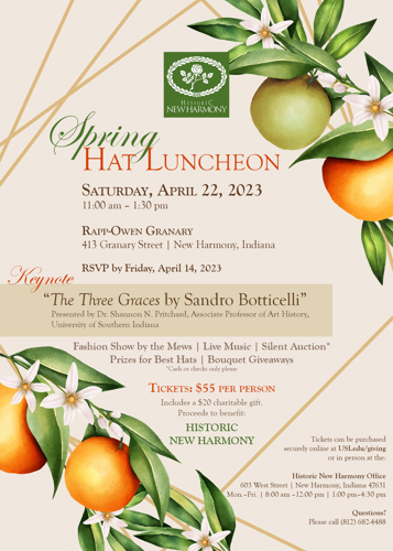 This event would not be possible without the support of many sponsors, including Indiana Humanities, Vicki and David Campbell, William and Kathleen Elliott, John H. Grizzell, Heritage Federal Credit Union, Josef Laposa, Barbara Northern, Kent and Laurie Parker Family Foundation, Laurel Vaughn, Karen Walker, Linda Willis, and Andrew Wilson. Historic New Harmony would also like to thank the Robert Lee Blaffer Foundation, the Working Men’s Institute, the Town of New Harmony, and the Posey County Health Department for their support, as well as the staff and volunteers who provided so many hours of their time.
