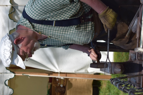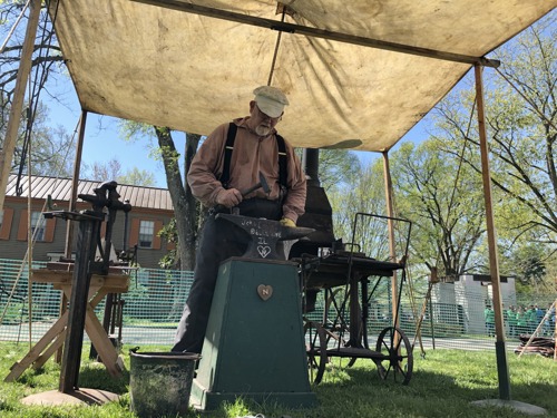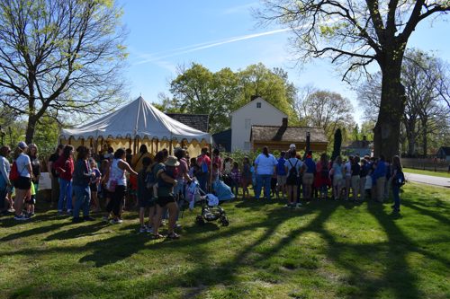 This year’s Heritage Artisans Days occurred on April 24 through 26 and featured mostly beautiful weather save for a few showers on Friday morning. During the three days, 2,208 children, teachers, and chaperones attended the event from 76 traditional schools and homeschools. Several artisans returned this year, including our 1800s doctor, basket weaver, blacksmith, candle dippers, fiddler, kettle corn vendors, oxen handlers, paper marbler, rope maker, and weaver. We also had a few new artisans join the event including an interpreter in the Harmonist Garden, a hat maker, a flax processor, hide tanner, and a tinsmith. As one teacher noted, “[her students] learned how tasks were completed in the old days, and hopefully, developed an appreciation for the convenience of things done today.”