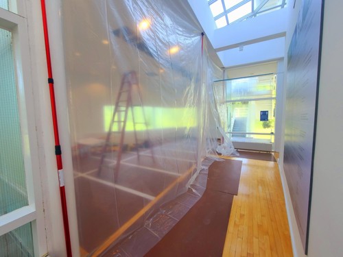 Work on the Atheneum roof started this week! As work continues, the entire roof, second and third floors will be closed off to the public, including the Clowes Theater and the 1824 town model. Crews will be replacing the tile on the top of the roof after repairing the drains. They will also be repairing water damage that has occurred on some inner walls and ceilings. Tours will still begin at the Atheneum, but the introductory film will be viewed in the Atrium, which was generously funded by the Kent and Laurie Parker Family Foundation. The construction will last a few months but once completed, the repairs will go a long way in the continued preservation of this icon of modern architecture.