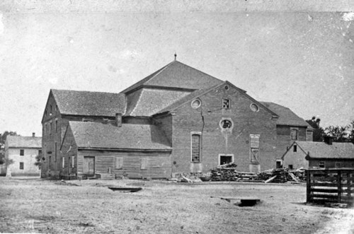 But wait… the information in the manual did not match the photo label. The manual stated, with no source listed, that the Cooper Shop we know as Black Lodge was the second cooper shop the Harmonists built in 1819 and was moved to its current location in 1975. Additionally, this building had been used as a residence from 1893 to 1975. Before that, the building had been situated at the back of its current location and attached to the Union Hotel. I believe this is just a typo and they meant Union Hall, the name of Thrall’s Opera House from 1856-1888.