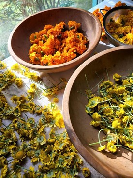 The dye process involved soaking the dye material (for example, marigold flowers or crushed walnut hulls) in water, heating it to simmer while the color is extracted, then straining the dye liquid. After this the wet wool, linen, cotton or silk yarns, tied loosely in skeins, were immersed in the dye liquid and gently heated. When the desired color of yarn was achieved, the skeins were removed, rinsed and allowed to air dry. For Harmonist looms, a very great quantity of dyed yarns would have been required—a mill could use up several hundred pounds of yarn for a month’s worth of weaving.