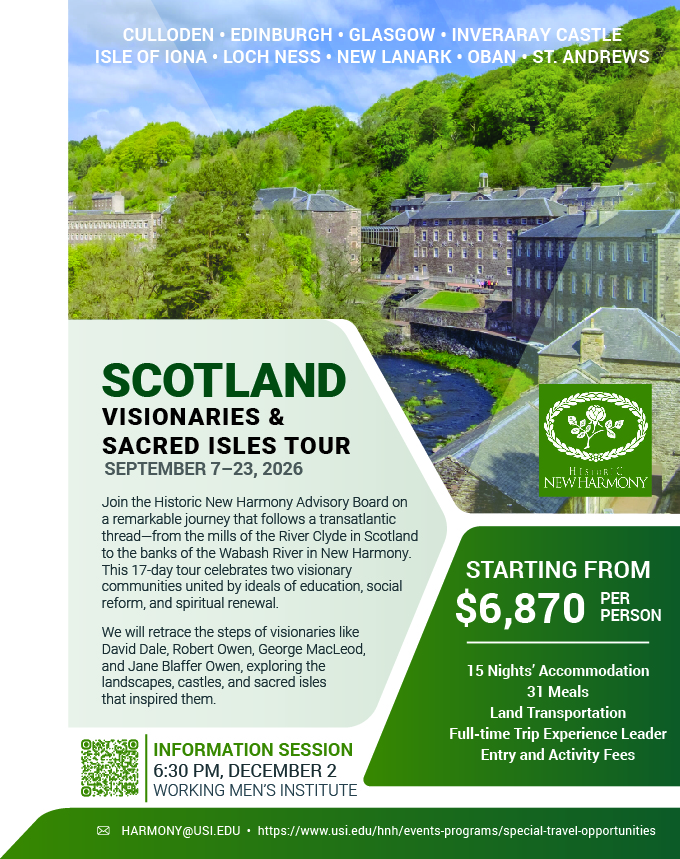 Join Historic New Harmony at the Working Men’s Institute at 6:30 pm on December 2 for an informative session with Docey Lewis, who will provide a clear, engaging overview of the upcoming Scotland: Visionaries & Sacred Isles journey. Docey will walk attendees through the highlights of this remarkable 17-day tour—from the private New Lanark Prelude to the customized Overseas Adventure Travel itinerary—while outlining essential travel details, estimated costs, physical requirements, and how to book both portions of the trip. Whether you’re considering joining the pilgrimage or simply want to learn more about the New Harmony–Scotland connection, this session offers the perfect opportunity to ask questions and understand the full scope of this unique travel experience.