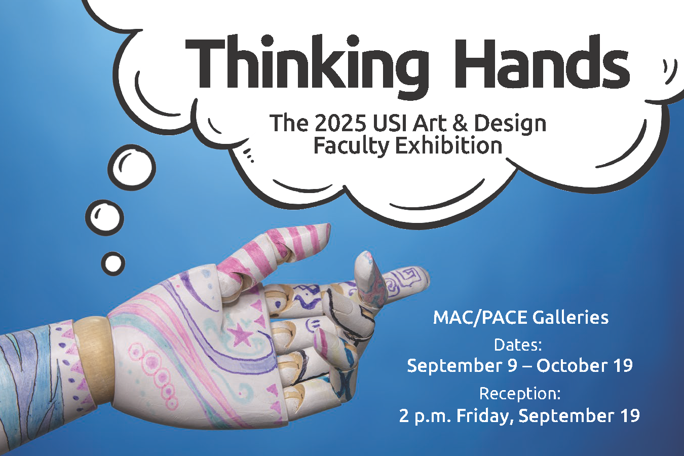 Faculty teaching studio art, graphic design, photography, and other digital media are highlighted in Thinking Hands, The Kenneth P. McCutchan Art Center/Palmina F. and Stephen S. Pace Galleries first exhibition of the fall semester. This exhibition features recent artworks by the artists and designers who make up the Art and Design Department at the University of Southern Indiana. The works on display will highlight the range of media and techniques championed by the department.