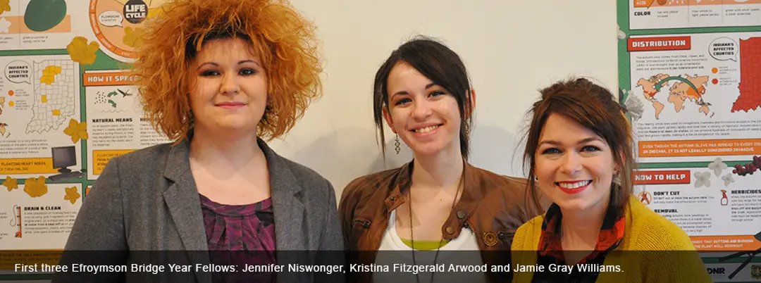 The Efroymson Bridge Year Fellowship is a competitive award program that provides a highly motivated and talented studio art, photography or design graduate of the University of Southern Indiana’s Art and Design Department with the opportunity to develop a strong portfolio in preparation for graduate study, which is often the foundation for a successful career as an artist, photographer or designer. The goal of the Efroymson Bridge Year Fellowship is to fund a post-undergraduate year which will allow the recipient to significantly expand their artistic vision, to enhance their portfolio, to gain maturity as an artist, photographer or designer, and to successfully gain entrance to graduate school in their area of expertise. The Fellowship experiences will make the Fellow much more competitive when applying for graduate school, especially in relation to the acquisition of assistantships.