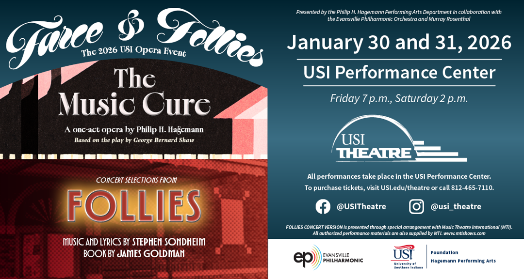 The University of Southern Indiana Philip J. Hagemann Performing Arts Department, in association with the Evansville Philharmonic Orchestra and Murray Rosenthal, are proud to present Farce and Follies: A USI Opera Event. Performances will take place at 7 p.m. Friday, January 30 and 2 p.m. Saturday, January 31 in the USI Performance Center.
