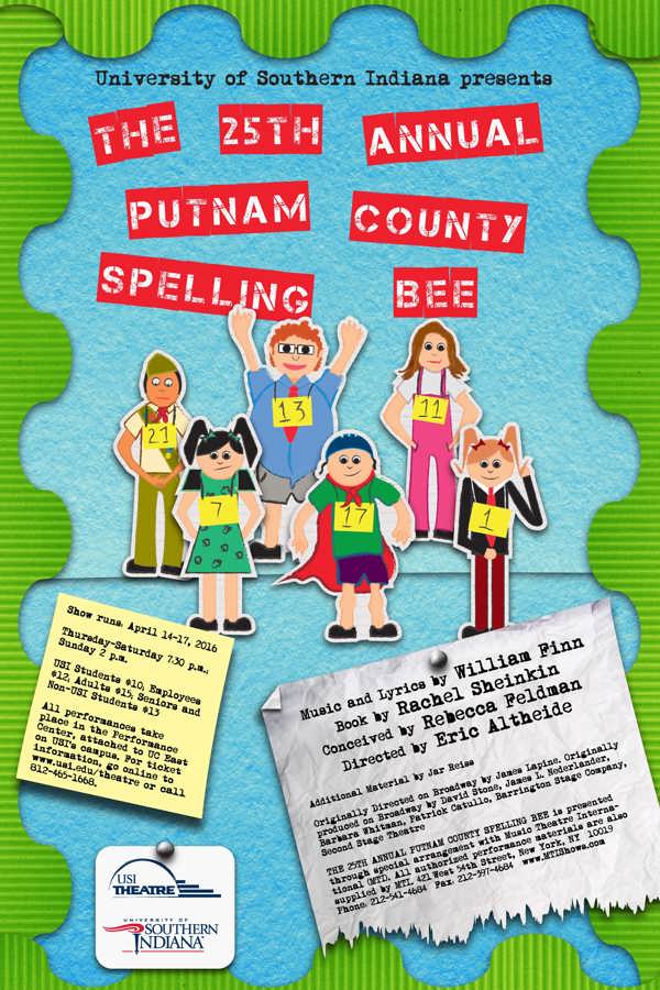 University of Southern Indiana Theatre will close its 2015-2016 season with the musical The 25th Annual Putnam County Spelling Bee with music and lyrics by William Finn, book by Rachel Sheinkin and conception by Rebecca Feldman. The production runs April 14-17 in the USI Performance Center located in University Center East.