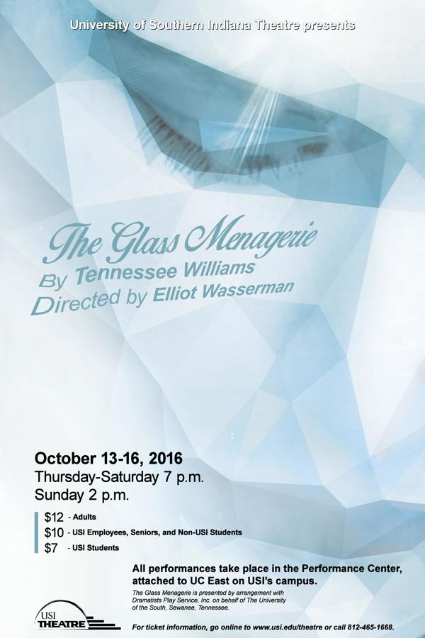 University of Southern Indiana Theatre will open it's 2016-17 season with The Glass Menagerie by Tennessee Williams. The production, directed by Elliot Wasserman, professor of theatre, runs October 13-16 in the USI Performance Center located next to University Center East on the USI campus.