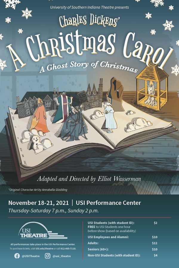 University of Southern Indiana Theatre continues its 2021-2022 live season with a Christmas classic: A Christmas Carol. This adaptation of Charles Dickens' beloved story was written and will be directed by USI's own Elliot Wasserman, Professor of Theatre. The production runs from November 18-21 in the USI Performance Center located in University Center East on USI's campus.