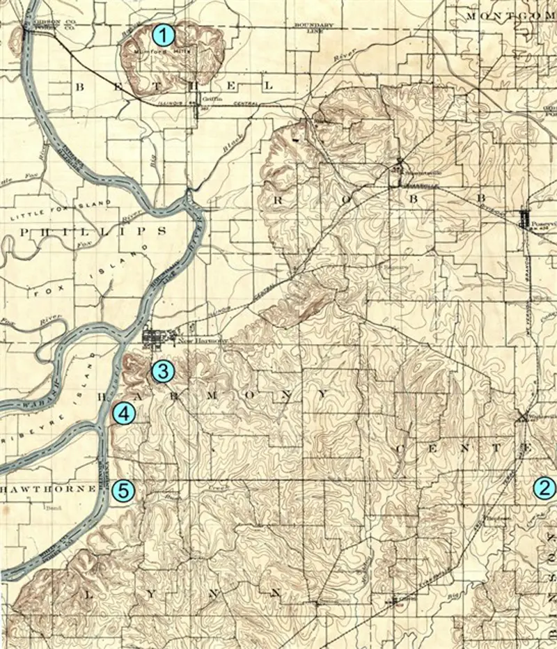 Important localities for early geologists near New Harmony included: