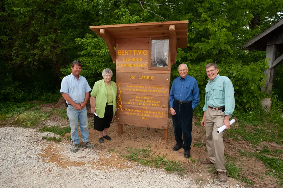 In the Fall of 2009, the Director of USI's Service-Learning Program, Dr. Anne Statham, Professor of Sociology, led several students through a refresh of the Bent Twig Trails at the northwest corner of campus. Students participating in the project laid gravel and mulch along the trails, cut back the natural growth encroaching on the walking paths and researched what native species could be planted along the paths. Azaleas were planted along the trails leading to Reflection Lake. Working with Dr. Charles Price, professor of science education and Don Fleming, USI's property supervisor, they planted many ferns along the main trail.