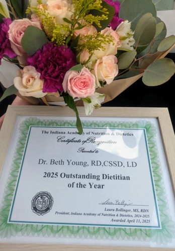 Dr. Beth Young, Assistant Professor and Chair of Food and Nutrition, has been named Outstanding Dietitian of the Year by the Indiana Academy of Nutrition and Dietetics. She was recognized and presented with the award during the organization’s annual meeting on April 11.