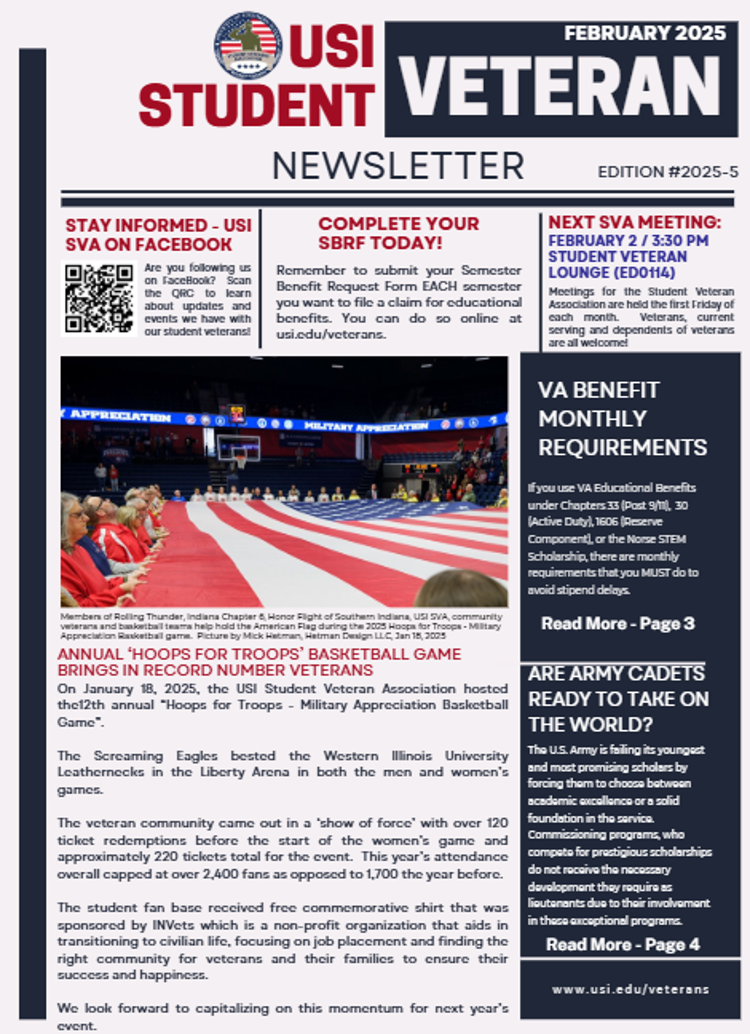 The USI Student Veterans Association (SVA) is a recognized chapter of the national Student Veterans of America. This is a student-run organization that provides camaraderie, support, and resources to help student veterans transition from military life to college life and succeed in their academic lives.