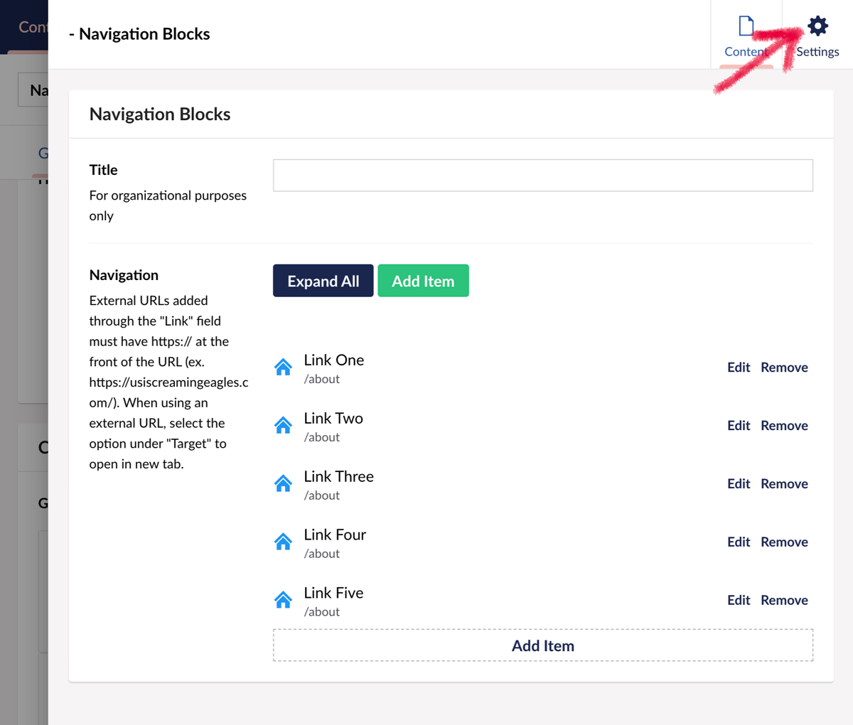After creating your navigation links, click on the Settings tab to access the styling options for Navigation Blocks.